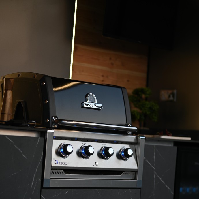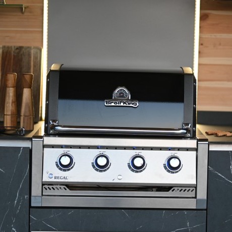 Our BBQKings outdoor kitchen is built around the Broil King® Regal™ 420. This top-tier grill offers 4032 sq. cm of primary cooking surface and includes 5 stainless steel Dual-Tube™ burners, reversible heavy-duty cast iron cooking grids, a warming rack, a stainless steel Flav-R-Wave™ cooking system, an electronic igniter, illuminated control knobs, and a stainless steel ignition switch.
